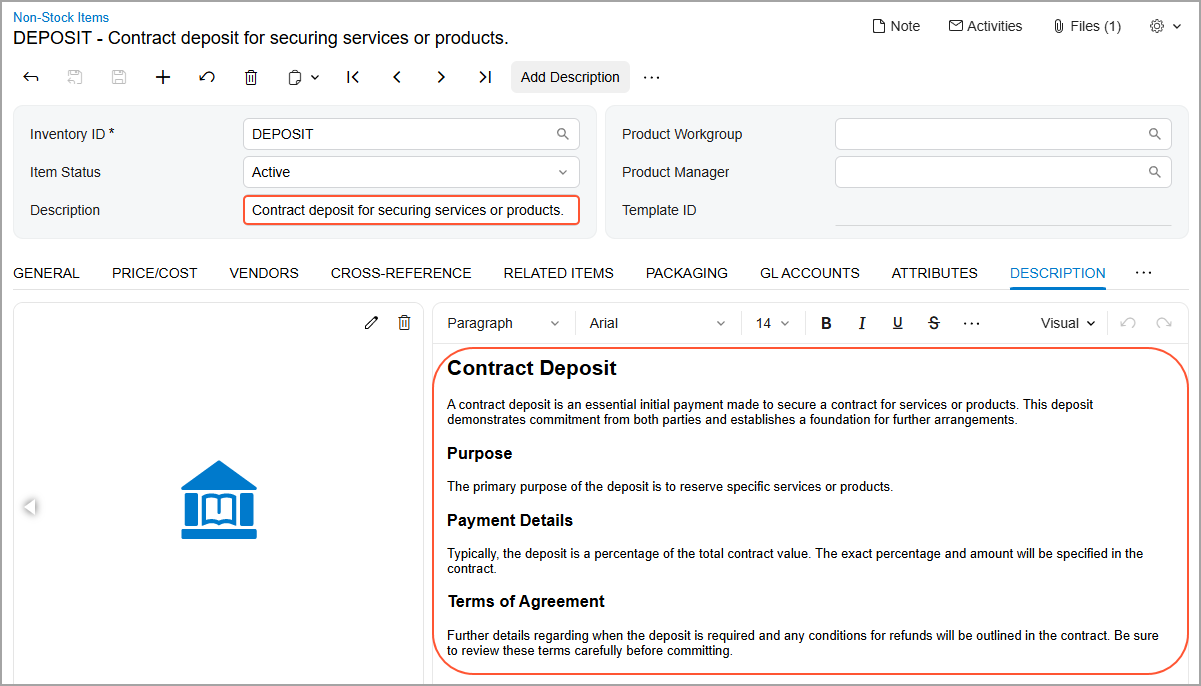 - Stock Item Desc: Uses inventory details to generate clear and professional product descriptions for the Description box and Description tab of the Stock Items (IN202500) form.