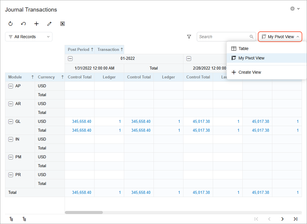 In the Modern UI, you can effortlessly toggle between the table and pivot data representations of generic inquiry forms. Pivot views support in-depth analysis of information from multiple perspectives, enhancing your ability to make informed decisions.