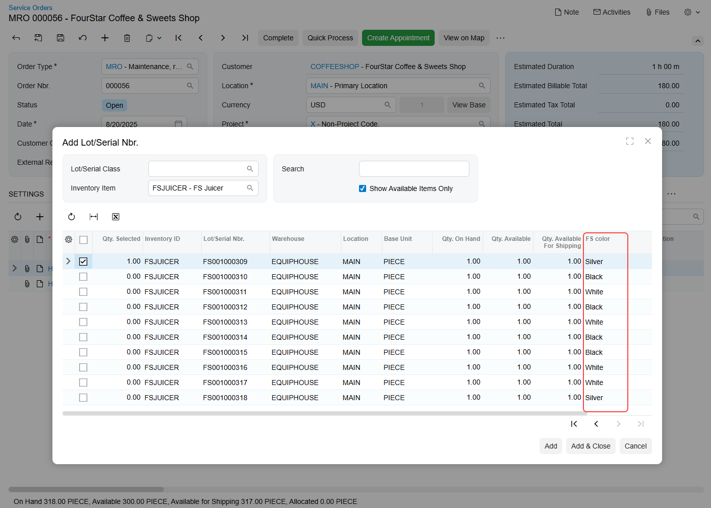 Selecting Lot- or Serial-Tracked Items with Attributes in Service Documents