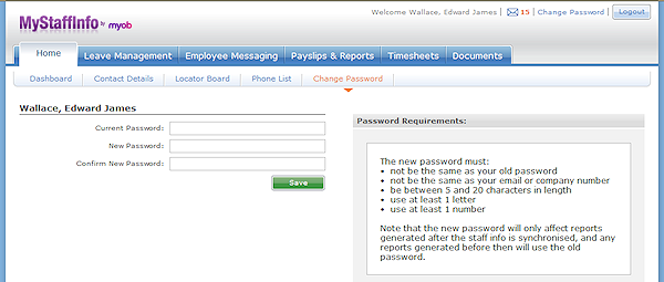 Click the Save button to permanently change your password. Note that any of your old payslip reports that may be held on the website will not reflect this change. Old payslips will be encoded with your old password, and any new payslips (pending a synchronise operation) will be encoded with your new password.