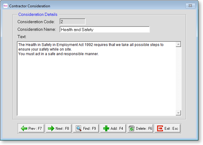 Text Enter text explaining the consideration. This text will appear on the Health and Safety Contract report when this consideration is added to a contractor.