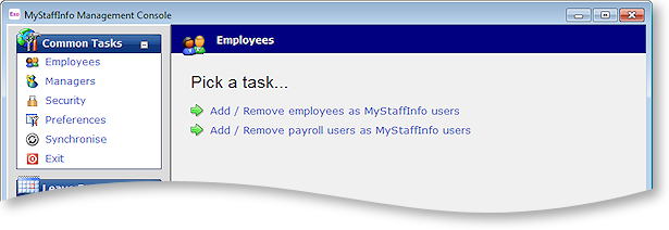From the Common Tasks pane, click the Employees task. The Employee tasks open in the task window on the right.