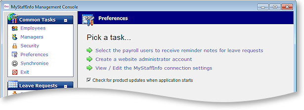 This screen contains customisation options relating to the MyStaffInfo website. From the Common Tasks pane, select the Preferences task.