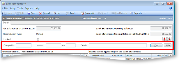 The system will search both sides of the reconciliation for transactions that match the criteria entered. The system is looking for transactions where Cheque No equals that specified and transaction Amount equals that specified +/- the variance and where the transaction’s detail contains the Details text entered.