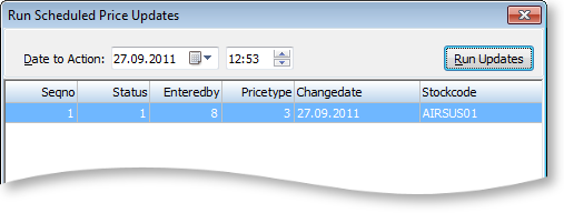 Once you have set up your scheduled price changes, use the Run Updates button to action any scheduled price changes with a status of Active. Scheduled Price Updates will not run automatically when the Change Date occurs.