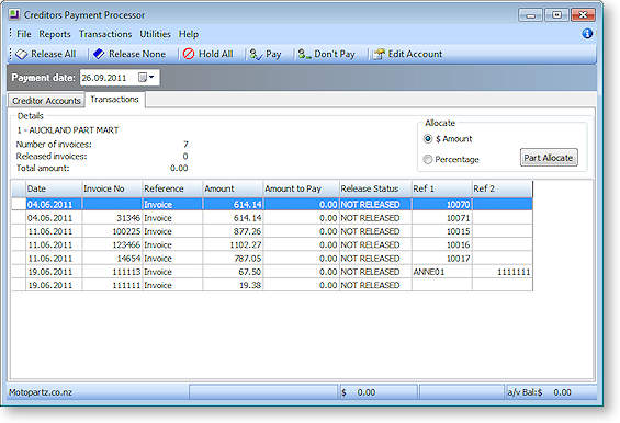 • The toolbar buttons on the Transactions tab (Release All, Release None, Hold All, Pay, Don’t Pay) affect all invoices on the selected Creditor account.