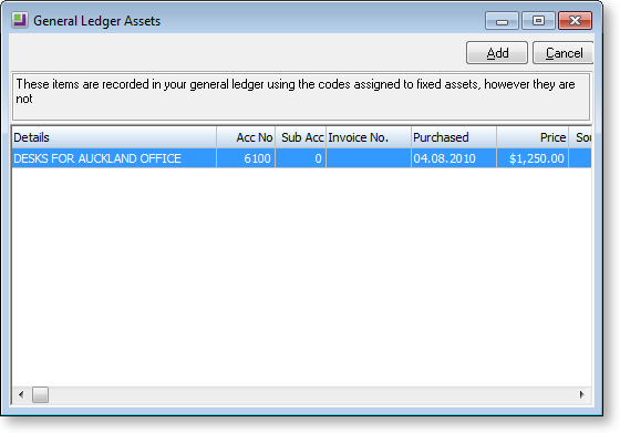 The General Ledger Assets window prompts you to add newly acquired assets that are on the General Ledger but not yet in Fixed Assets:
