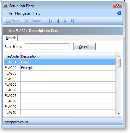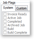 There are also a number of user-definable job flags that can be manually set. Examples of these might be "Awaiting parts" or "Awaiting credit approval". These flags cannot be raised automatically by a change in job status like the systems flags. They can be very useful for reporting or controlling the flow of jobs around the business. All user flags are assumed to be False when the job is created, so the flag name should be phrased to reflect this, e.g. "Quality Checked" is false until checked. "Awaiting parts" is false until checked. The list of jobs that are "Ready for installation" might represent the "installers" in-tray of work. The job Search is highly configurable and will remember the combination of flags and statuses picked as default search list.