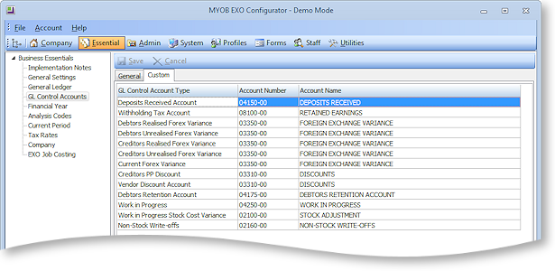 Select GL Control Accounts from the Business Essentials menu. The GL Control Accounts screen is displayed.