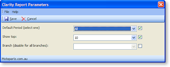 Notice that parameter defaults are shown if there are not already parameter values assigned to this dashboard; otherwise the previously selected parameter values are shown. Select the desired values and click Save. Notice how the parameters are added after the report (CLR) name in the Report Settings field, using the same format as regular command-line parameter values.