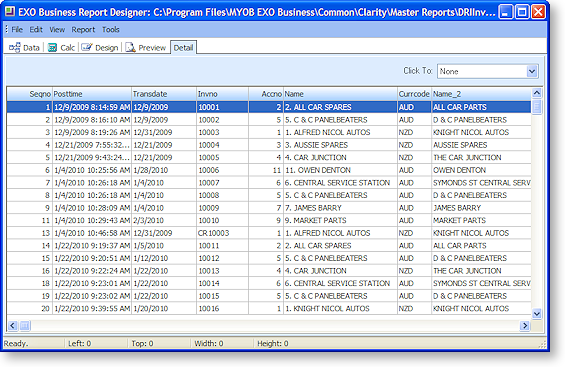 This tab is the equivalent of the powerful Report to Grid option in previous MYOB EXO Business versions. It displays the data obtained from the data source that has been selected for the primary detail. The specific MYOB EXO Business component procedure can be selected when drilling on the line in the details band of the report.
