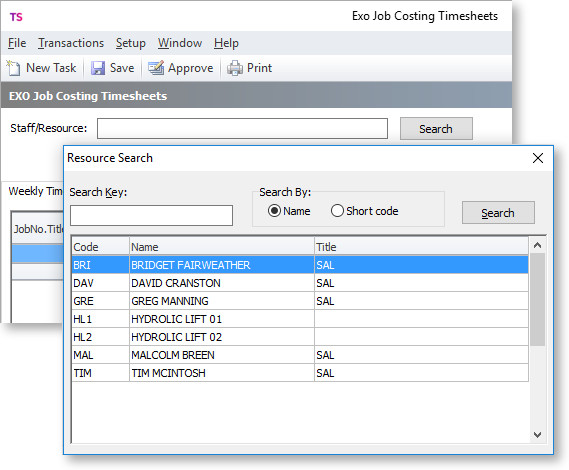 The username you use to login will be the default job resource name used in the timesheet application, if the resource is a staff member. If not, you will need to specify one - click the Search button to open the Resource Search window: