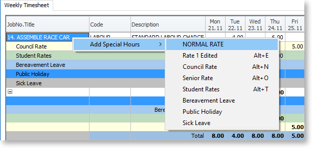 Once you have selected the job you can select a work code. These are codes from EXO Business inventory or price book. The normal pay rate will apply to a line entered, but you can immediately apply special pay rates by right-clicking on the line and selecting from the Timesheet Rates that you defined previously.