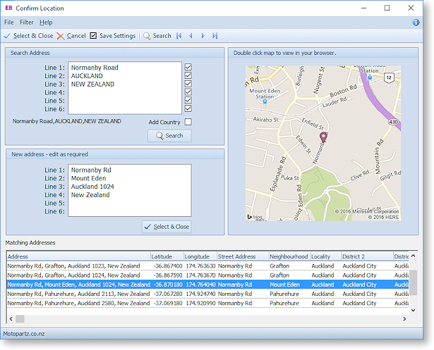 Clicking the button opens a window where you can verify the matched address, or select one if multiple search results are returned.