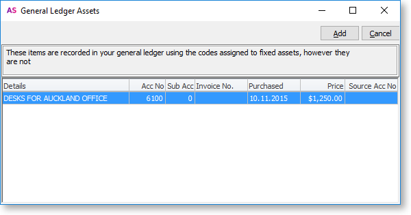 The General Ledger Assets window prompts you to add newly acquired assets that are on the General Ledger but not yet in Fixed Assets: