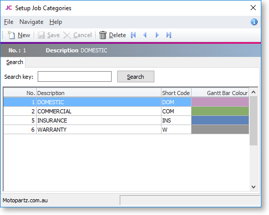 For example, appropriate Job Categories for the Motorpartz demo database, under a Job Type of "Full Service", might be "Oil Change", "Fault Inspection", "Replace Parts", and "Miscellaneous". Another common use for Job Category might be to signify "Urgent" and "Non-urgent" jobs.