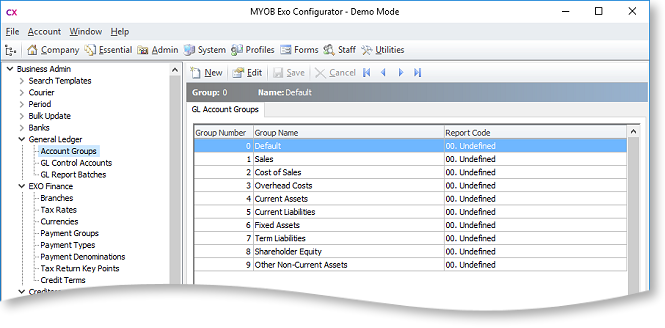 To set up a GL account group, select Setup GL Account Groups from the MYOB Exo Business Setup menu: Setup > Business Admin Settings > Account Groups. The GL Account Groups window is displayed.