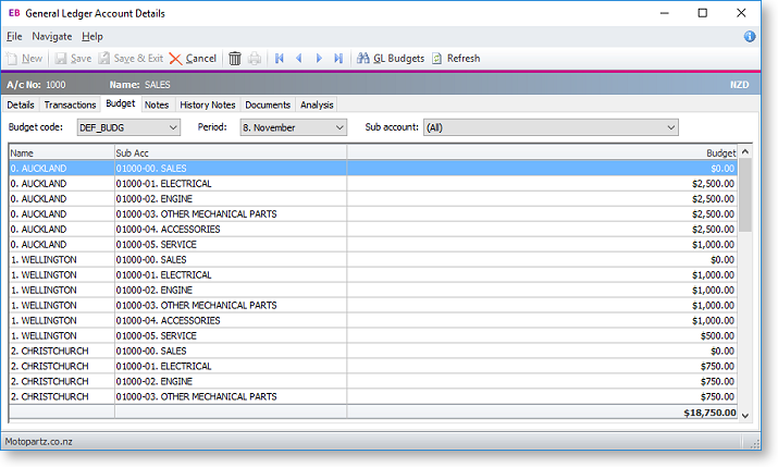 To edit a budget, click the GL Budgets button to open the GL Budgets window. You can now make changes to the budget.