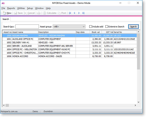 The main Fixed Assets window displays a Search tab used to locate an existing asset for enquiry or maintenance: