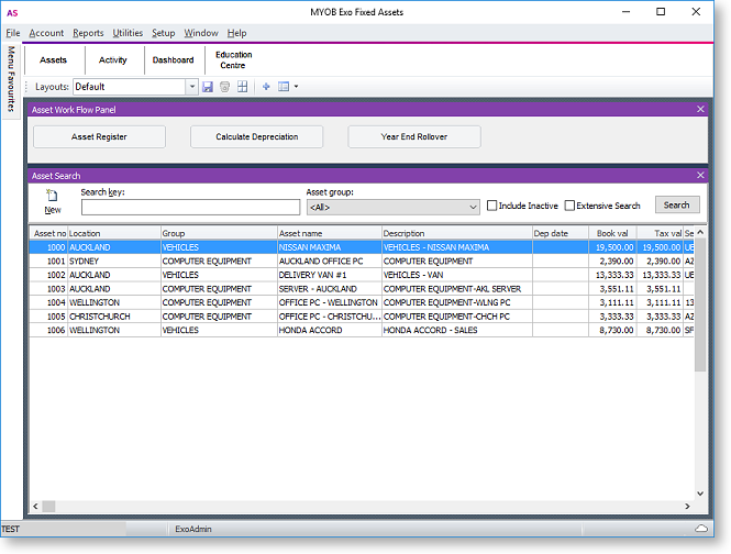 You can also open the Asset Search grid in a new window by selecting Asset Register from the Account menu, or clicking the Asset Register button on the Assets tab of the main business flow menu. This opens two windows: