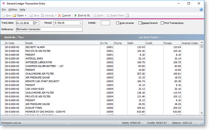 Once all transactions that you want to eliminate have been transferred to the lower grid, click Eliminate to creates a GL Journal to eliminate the selected transactions. A confirmation message appears - click Yes and the journal entry screen appears: