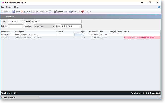 Click Save to save all stock movement transactions in one operation. Any errors in the imported data are highlighted in the Errors column; the batch cannot be saved if any errors are present.