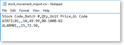 Provided a header row is included, you do not need to include every column from the Stock Movements window. If there is no header row, the import function will attempt to import data into columns on the window from left to right.