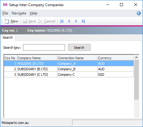 This setup is not carried out in the InterCompany module; rather it is done in the Exo Business Configurator application at Admin > EXO Intercompany Consolidations > Inter-Company Companies or in the main Exo Business module, if the Inter-Company Companies option has been added to the menus.