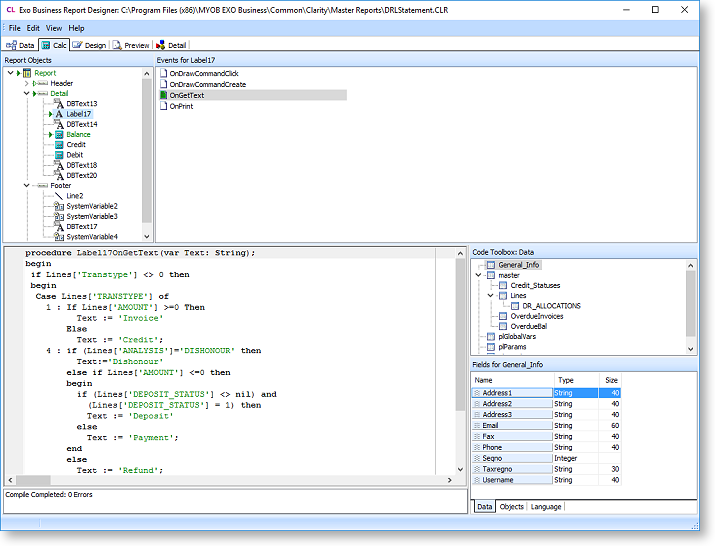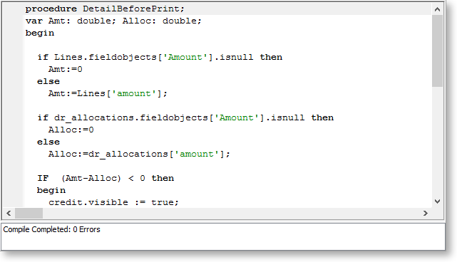 Note: Writing code for a report requires a good degree of familiarity with Exo Business database structures and knowledge of the Delphi programming language.