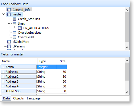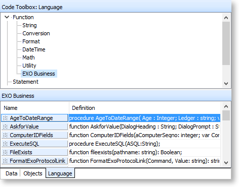 The lower right section of the Calc tab contains a library of elements and code templates that you can drag and drop into the code pane to save typing time. The toolbox is divided into three tabs: Data, Objects and Language.