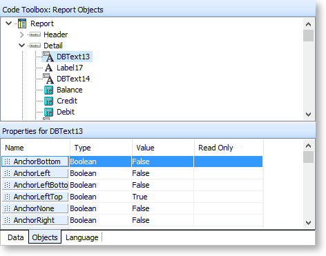 This tab displays all report bands and the components they contain, similar to the Report Tree on the Design tab. Clicking on a component displays all of its properties - you can drag a property into the code pane to insert code that defines that property.