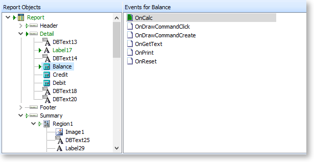 In Events mode, the tree displays all report bands and the components they contain, similar to the Report Tree on the Design tab. When a report component is select, all events that can be triggered for the component appear in the pane on the right - these can include events such as when the component is drawn, when it is clicked on or when its value is calculated. This lets you control how the report should behave whenever one of these events occur.