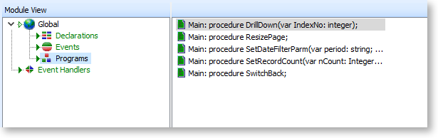 Global > Programs - Lets you enter global functions and procedures that can be reused elsewhere in the report. (A function is a piece of code that returns a value, while a procedure performs actions but does not return anything.) To create a new global function or procedure, right click on the list of functions and procedures and select New Function or New Procedure.