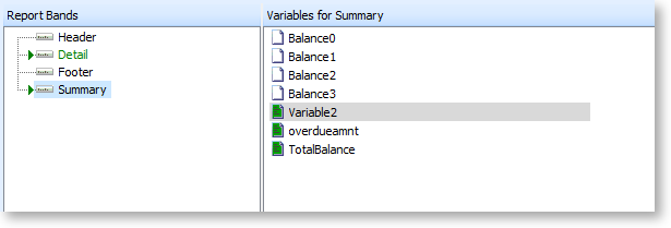In Variables mode, the tree displays each report band that is visible in the report. When a band is selected, all Variable components on that band appear in the pane on the right, allowing you to set the calculation code for multiple variables quickly and easily.