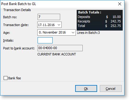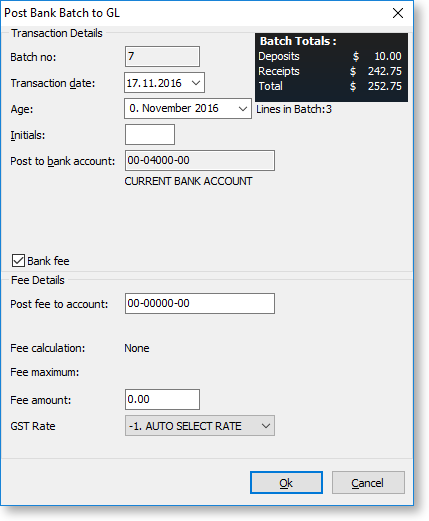 Click OK. If you are posting multiple batches, this window displays for each batch in turn. Review the transaction details and enter bank fees for each batch.