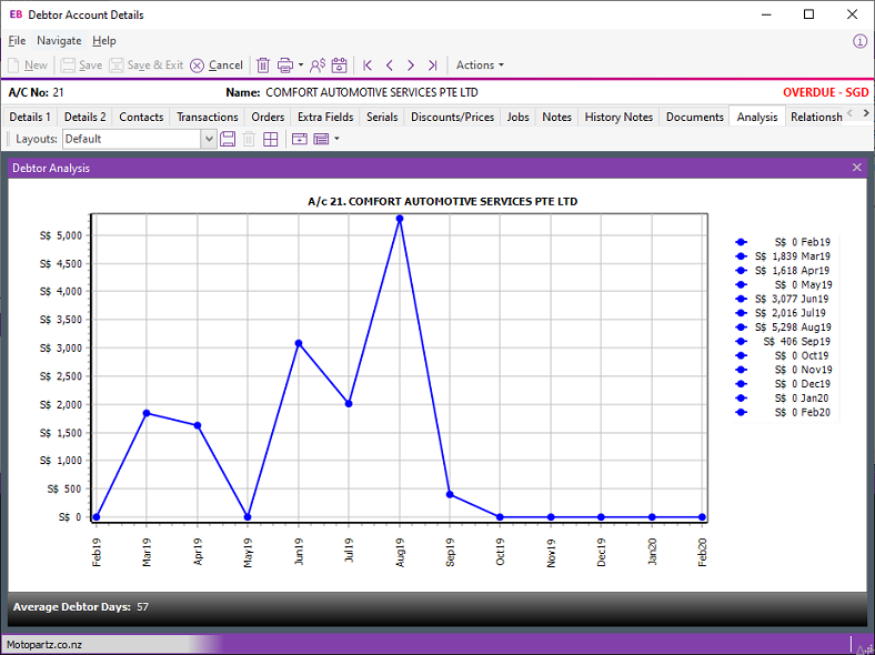 The Average Debtor Days value indicates the average number of days that the debtor takes to pay their invoices. This value is only visible if the Show average debtor days profile setting is enabled.