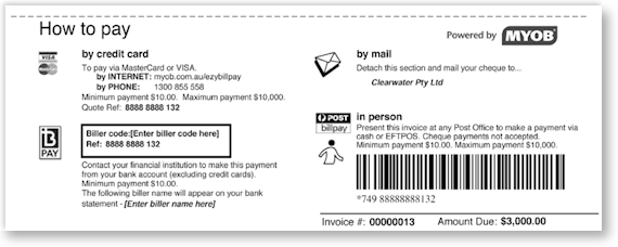 Using M-Powered Invoices, your debtors can pay you via BPAY®, credit card online or by phone, or any Australia Post outlet. To use M-Powered Invoices: