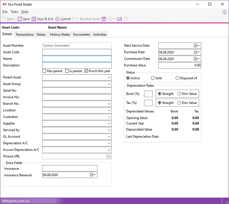 Select whether the asset is Active (with you and being depreciated), has been Sold or has been Disposed of. |