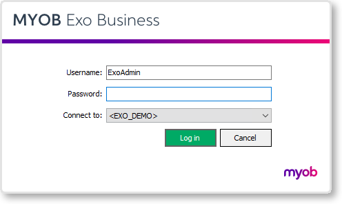 Log in as an administrator, selecting the database that you use with Exo Business. Click OK.