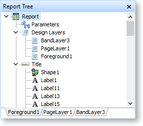 All design layers in the report are displayed on the Report Tree. Initially, there is only a single Foreground layer; if more layers are added, tabs appear at the bottom of the tree, allowing you to switch between them:
