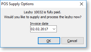 After saving the deposit and optionally printing the deposit receipt, the lay-by is checked to see if it is fully paid. If so, POS will ask to supply it.