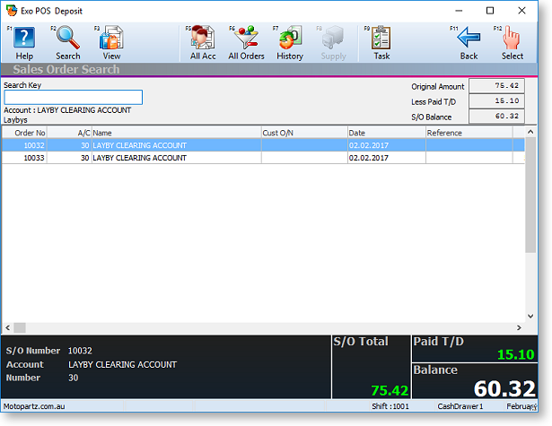 A deposit is an additional payment against a lay-by. This could be an interim instalment or a final payment. These payments cannot be allocated until after the goods are supplied and an invoice created and are therefore accumulated against the order number of the lay-by.