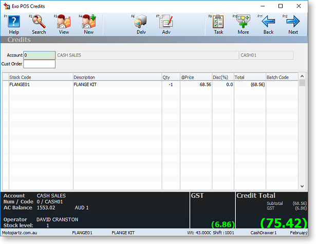 To generate a credit note, click Credits or press F7 from the Task Organiser. The process of creating a credit note is similar to the process of making a sale. Use this process where a credit note is to be produced instead of an invoice. A credit note has a negative overall value.