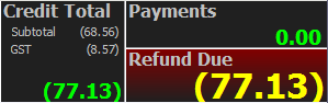 - Refund Under - Insufficient refund payment rows have been entered to satisfy the credit note total. This is a situation that must be rectified by entering or altering payment rows the background colour will also be red.