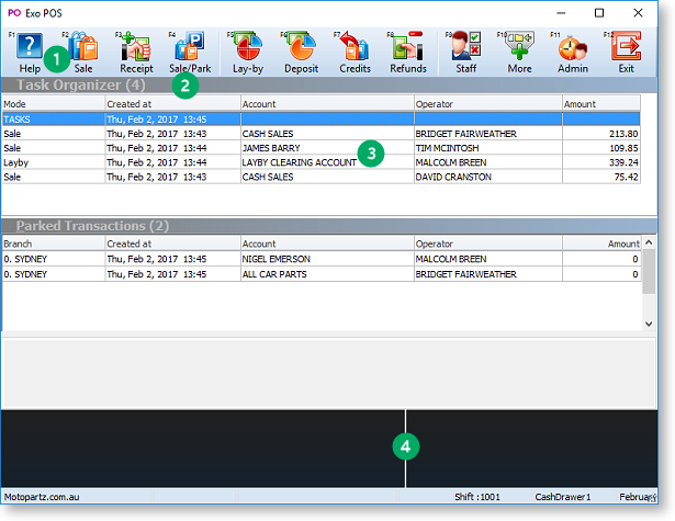 The Task Organizer is the main interface for the POS module, and is used to launch new tasks (transactions) or retrieve parked tasks. The main areas of the window are described below.
