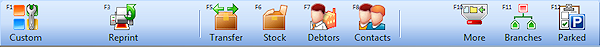 Access additional options. The More button changes the toolbar to reveal additional tasks including invoice reprint, stock in and stock transfers. Holding down the CTRL key also activates the More options. |