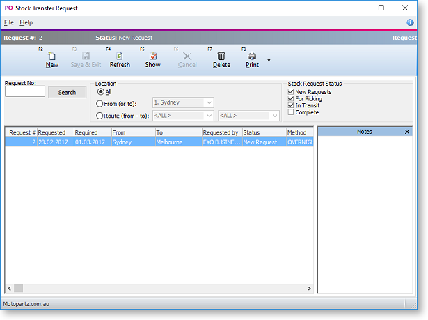 Note: If you have the Distribution Advantage module installed, the Transfer button runs the Stock Transfer Requests module instead. This module allows for staged transfers to occur starting as a Request, followed by a Send from source to in transit location, and completed with a Receive from in-transit to destination location. For more information and operational instructions on this module see the online Help for the Distribution Advantage module.