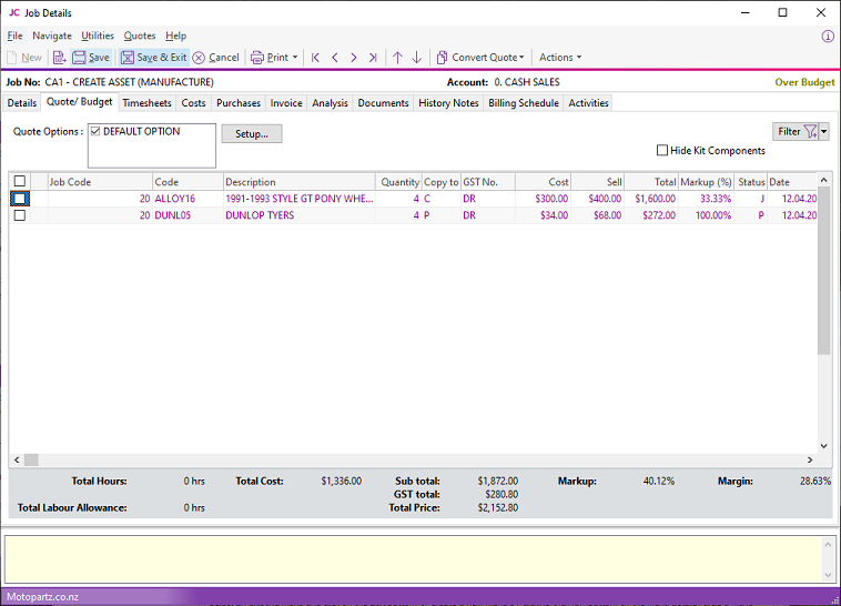 To enter quote or budget information for a job, select the job and click the Quote/Budget tab.