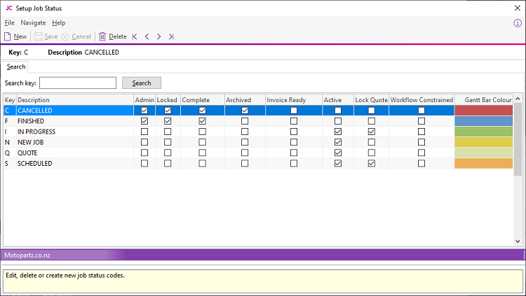 For example, a job is at the stage of Quote, New Job, Work In Progress, Finished, or Cancelled. A job can have two statuses representing cancelled jobs: one you cancelled as a result of losing a quote to a competitor (Lost Quote), and one cancelled when a quotation was withdrawn. Both of these statuses are non-active jobs, either Archived or Locked. Use an analysis report to differentiate between the statuses.