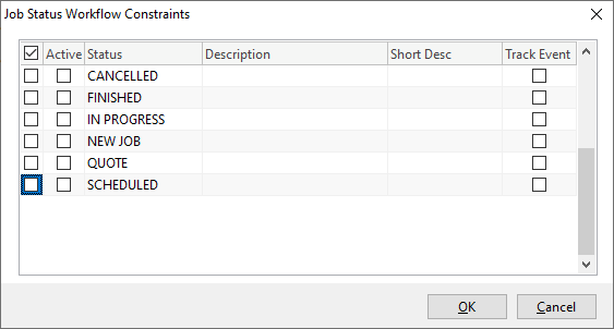 Select the boxes in the Active column to specify which statuses you can move a job to from this status. To record the history of the status movement, select the boxes in the Track Event column as well.